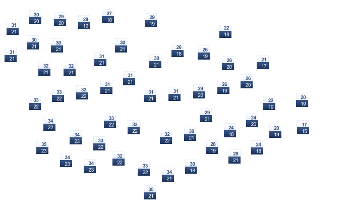 | 28 | 30 | 33 | 34 | 32 | 32 | 31 | 31 | 31 | 31 | 30 | 28 |