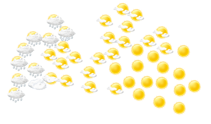 In Dagda ist es tagsüber sonnig und die Temperaturen liegen zwischen 1 und 12°C. Nachts gibt es keine Wolken und die Sterne sind klar zu erkennen bei einer Temperatur von 1°C. Der Wind weht aus südöstlicher bis südlicher Richtung mit Geschwindigkeiten von 11 bis 20 km/h. Böen können Geschwindigkeiten zwischen 24 und 44 km/h erreichen.