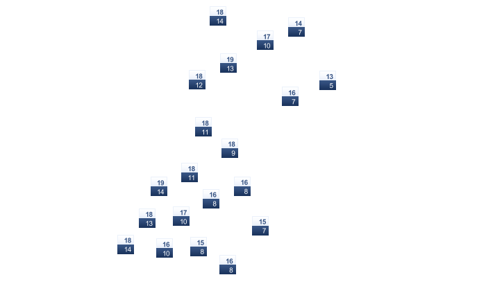 | 16 | 17 | 19 | 22 | 26 | 29 | 31 | 32 | 30 | 27 | 23 | 19 |