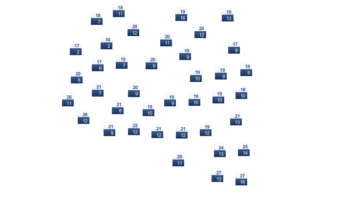 | 18 | 19 | 22 | 26 | 30 | 33 | 32 | 33 | 32 | 29 | 24 | 19 |