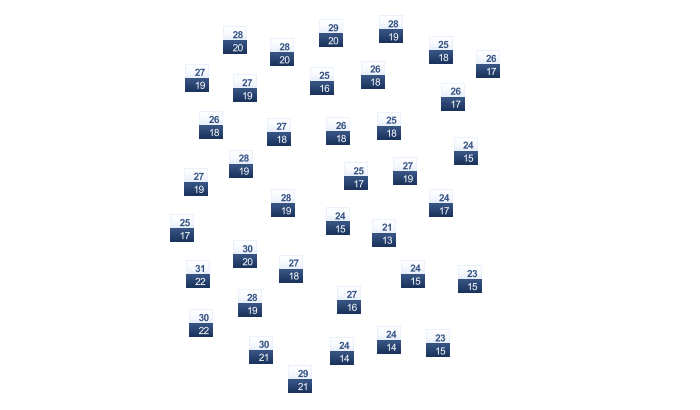 | 29 | 29 | 29 | 28 | 26 | 25 | 24 | 24 | 25 | 26 | 28 | 29 |
