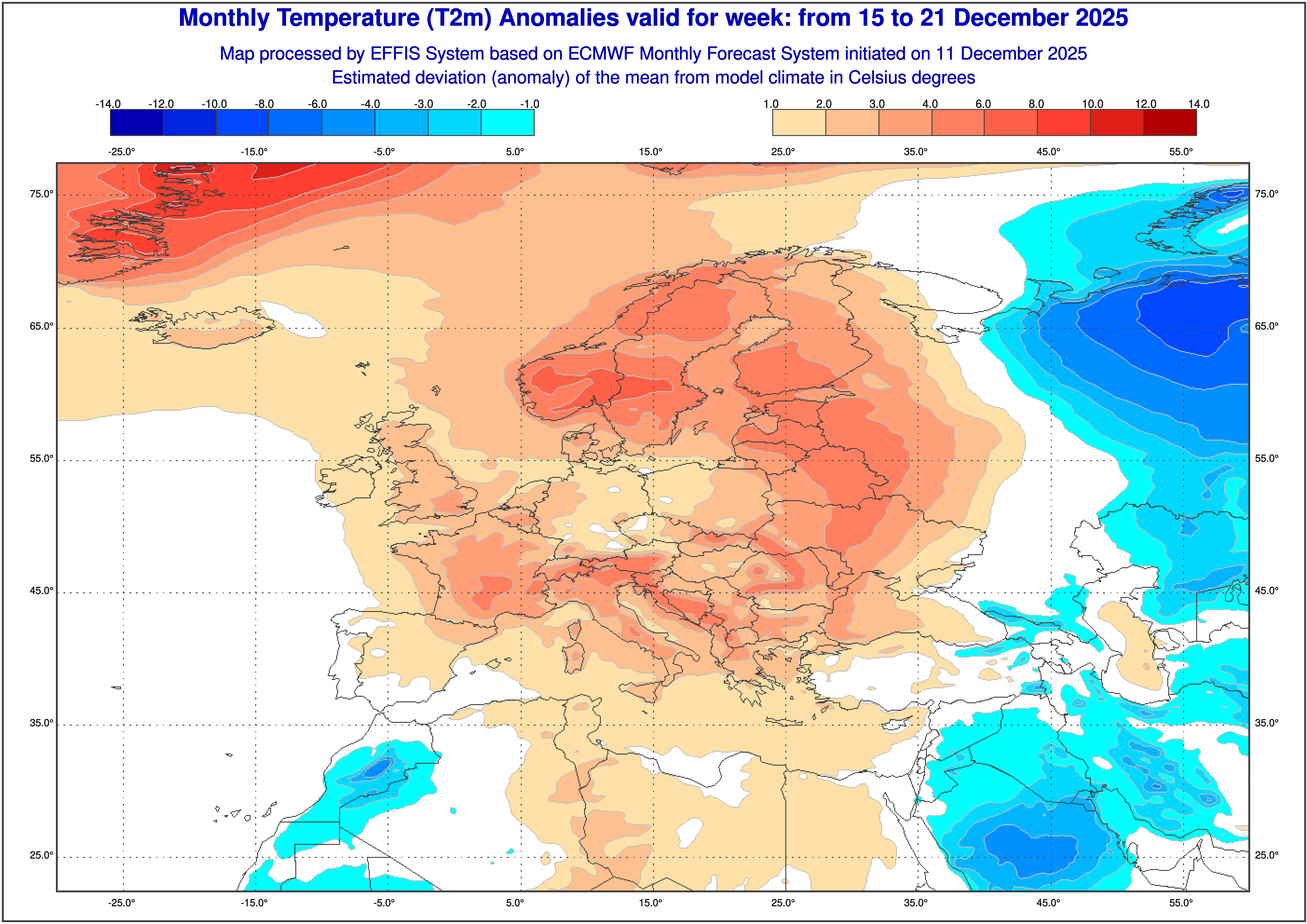 Die zweite Dezemberwoche wird von dem europäischen Modell im Moment deutlich zu mild berechnet. (Quelle: ECMWF/EFFIS)