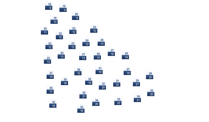 | 33 | 36 | 38 | 39 | 38 | 35 | 32 | 31 | 32 | 34 | 35 | 33 |