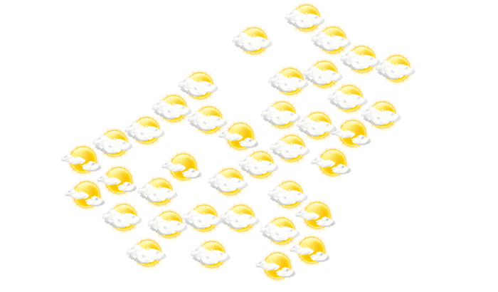 In Kadiolo gibt es morgens lockere Bewölkung bei Temperaturen von 25°C. Im weiteren Verlauf des Tages sind von mittags bis zum Abend hin Teile des Himmels mit Wolken bedeckt, die Sonne ist aber zwischendurch sichtbar bei Temperaturen von 34 bis 39°C. In der Nacht bilden sich vereinzelt Wolken bei Tiefstwerten von 28°C.