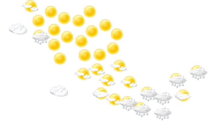 In León strahlt von Tagesbeginn bis zum Nachmittag die Sonne und die Temperaturen liegen zwischen 16 und 28°C. Am Abend gibt es in León nur selten Lücken in der Wolkendecke bei Temperaturen von 17 bis 19°C. In der Nacht bilden sich leichte Wolken bei Tiefstwerten von 13°C.