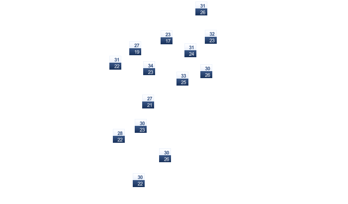 | 31 | 32 | 31 | 30 | 28 | 26 | 25 | 26 | 28 | 29 | 30 | 31 |