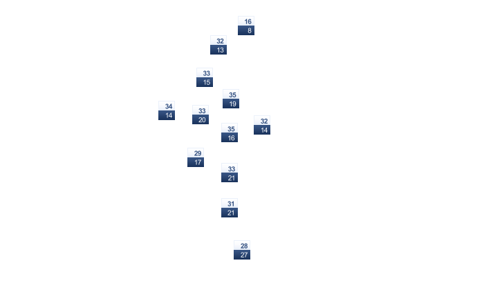 | 28 | 31 | 36 | 38 | 37 | 34 | 34 | 33 | 33 | 32 | 29 | 27 |
