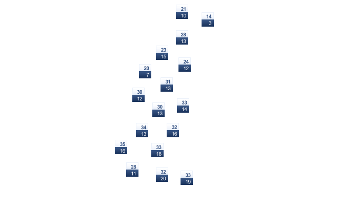 | 28 | 31 | 36 | 38 | 37 | 34 | 34 | 33 | 33 | 32 | 29 | 27 |