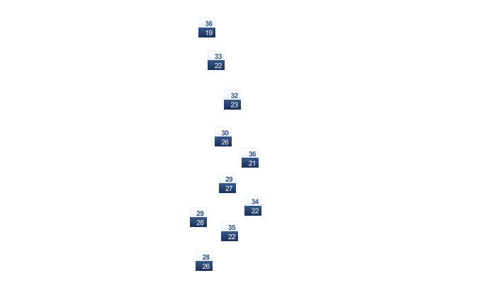 | 28 | 31 | 36 | 38 | 37 | 34 | 34 | 33 | 33 | 32 | 29 | 27 |