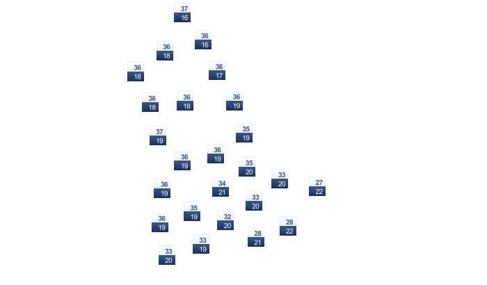 | 28 | 31 | 36 | 38 | 37 | 34 | 34 | 33 | 33 | 32 | 29 | 27 |