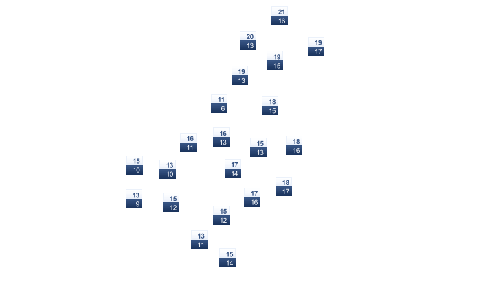 | 22 | 22 | 20 | 17 | 14 | 11 | 11 | 12 | 15 | 17 | 19 | 21 |