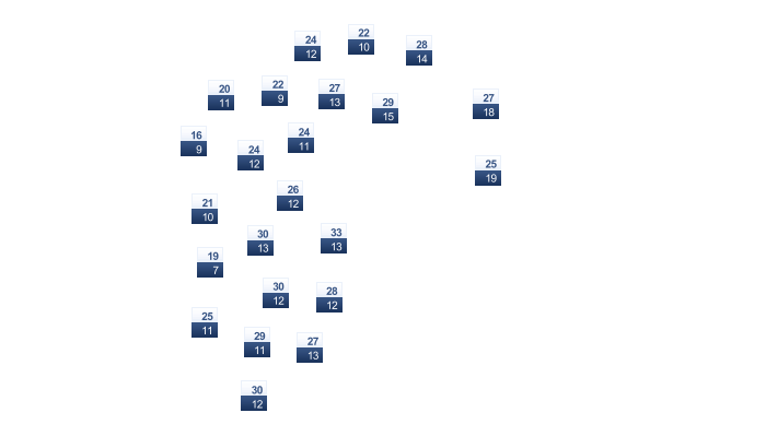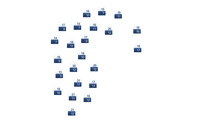 | 22 | 22 | 20 | 17 | 14 | 11 | 11 | 12 | 15 | 17 | 19 | 21 |