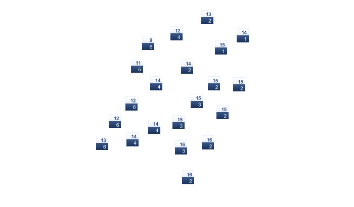 | 3 | 3 | 4 | 7 | 10 | 14 | 15 | 16 | 14 | 10 | 7 | 6 |