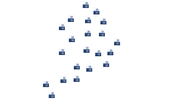| 19 | 22 | 23 | 23 | 23 | 22 | 21 | 21 | 21 | 21 | 20 | 19 |