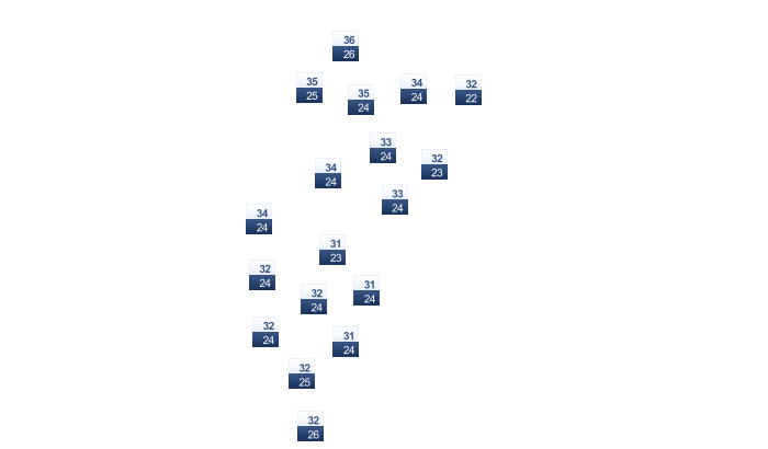 | 34 | 36 | 36 | 34 | 33 | 31 | 29 | 29 | 30 | 31 | 34 | 34 |