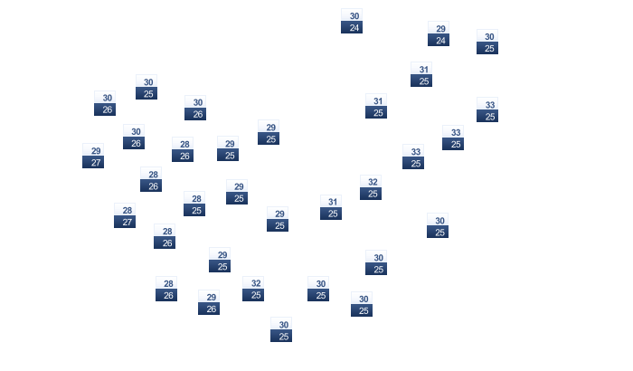 | 34 | 36 | 36 | 34 | 33 | 31 | 29 | 29 | 30 | 31 | 34 | 34 |