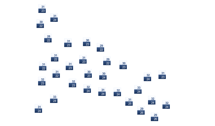 | 34 | 36 | 36 | 34 | 33 | 31 | 29 | 29 | 30 | 31 | 34 | 34 |