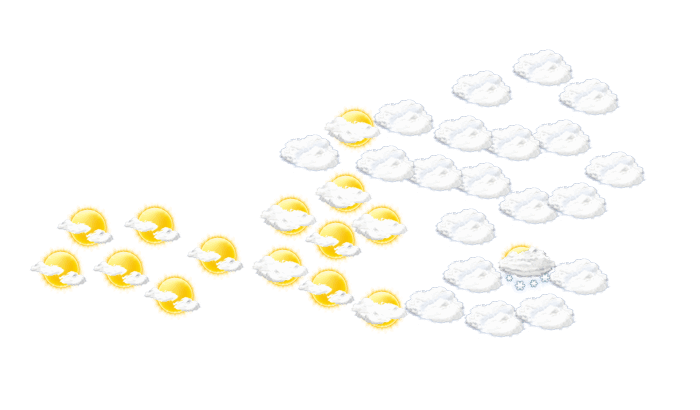 Am Montag setzt sich das meist ruhige Wetter fort. Besonders in tiefen Lagen ist es grau durch Wolken und Hochnebel, die örtlich auch etwas Schnee bringen. Auf den Bergen scheint dagegen oft und lange die Sonne. Die Temperaturen liegen zwischen -2 und +3 Grad, nur mit viel Sonne werden bis +5 Grad erreicht.