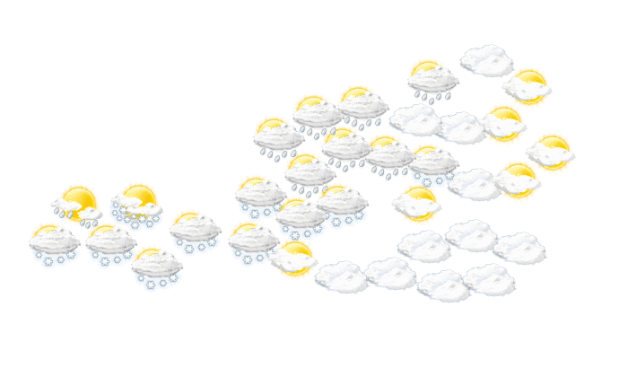 Am Montagvormittag ziehen von Vorarlberg bis Oberösterreich Wolken durch und zeitweise regnet oder schneit es. Die Schneefallgrenze liegt meist zwischen 400 und 800 Meter Höhe. Im Osten und Süden bleibt es größtenteils trocken und zwischendurch zeigt sich die Sonne. Verbreitet weht lebhafter bis kräftiger Wind aus West bis Nordwest, nur der Süden ist schwach windig. Am Nachmittag ziehen die Wolken weiter in den Osten und gegen Abend nimmt der Niederschlag von Westen her wieder zu. Im Süden zeigt sich die Sonne am häufigsten. Die Temperaturen erreichen 1 bis 8, mit Sonne bis zu 13 Grad. In 2000 Meter Höhe hat es um minus 5 Grad.