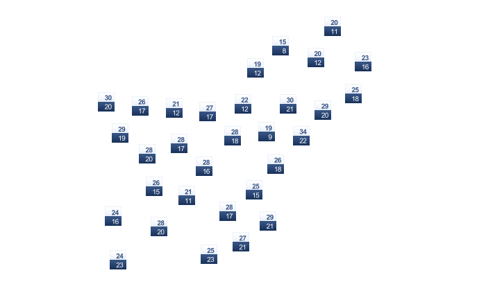 | 17 | 20 | 26 | 33 | 38 | 42 | 43 | 41 | 38 | 32 | 25 | 20 |