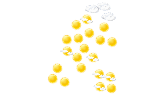 In Canto del Llano gibt es am Morgen einen wolkenlosen Himmel und die Temperatur liegt bei 20°C. Im Laufe des Mittags wird die Sonne von einzelnen Wolken verdeckt und die Höchstwerte liegen bei 32°C. Abends ist es in Canto del Llano wolkenlos bei Werten von 23 bis zu 25°C. Nachts ist es klar bei Werten von 21°C.