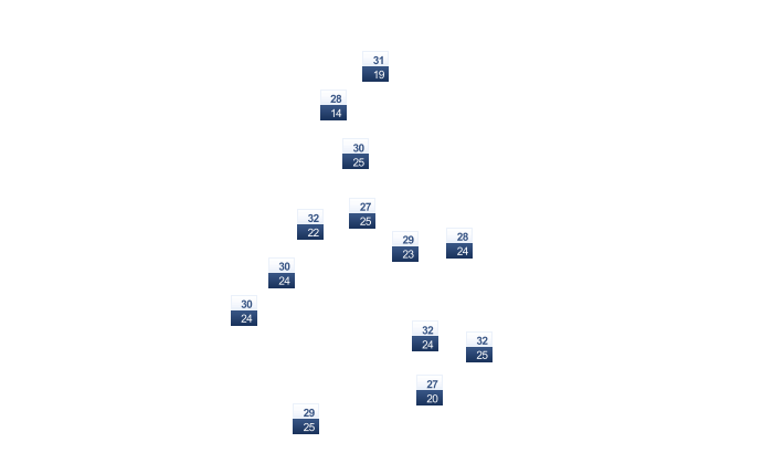 | Temperatur Höchstwerte °C | 22 | 23 | 24 | 25 | 25 | 23 | 23 | 22 | 23 | 23 | 23 | 23 |