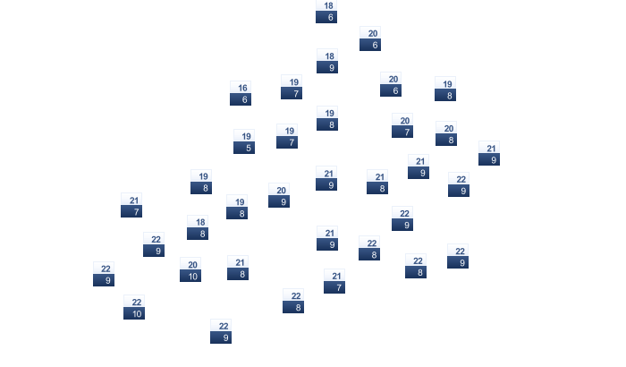 | 7 | 8 | 9 | 11 | 14 | 17 | 19 | 20 | 18 | 15 | 11 | 9 |