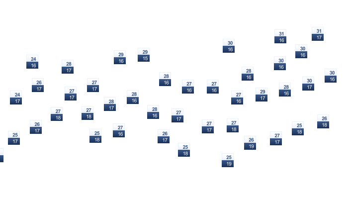 15 | 17 | 18 | 20 | 25 | 28 | 32 | 32 | 29 | 24 | 19 | 17 |