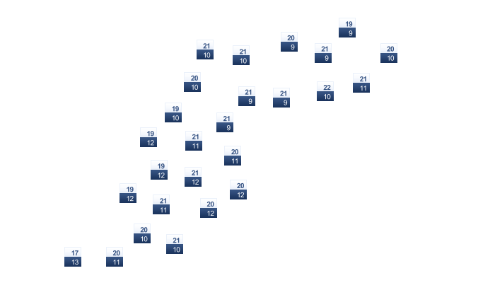 | 7 | 8 | 9 | 11 | 14 | 17 | 19 | 20 | 18 | 15 | 11 | 9 |