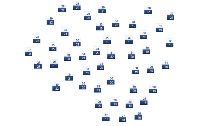 | 28 | 29 | 29 | 30 | 31 | 31 | 31 | 32 | 32 | 31 | 30 | 29 |