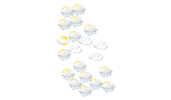 In Pskow kommt es von morgens bis zum Nachmittag zu Schneefällen bei Temperaturen von -1 bis 1°C. Abends sind in Pskow Teile des Himmels mit Wolken bedeckt und die Werte gehen auf -2 bis -1°C zurück. In der Nacht ist es wolkig bei einer Temperatur von -2°C. Böen können Geschwindigkeiten zwischen 21 und 38 km/h erreichen.