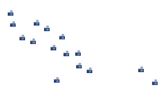 In Tulagi gibt es vormittags und auch am Nachmittag nur selten Lücken in der Wolkendecke bei Werten von 29°C. Abends ist in Tulagi der Himmel bedeckt und die Temperatur liegt bei 29°C. Nachts bleibt die Wolkendecke geschlossen und das Thermometer fällt auf 26°C.