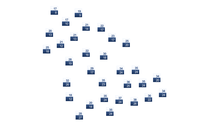 | 20 | 23 | 28 | 33 | 39 | 42 | 43 | 43 | 40 | 35 | 28 | 22 |