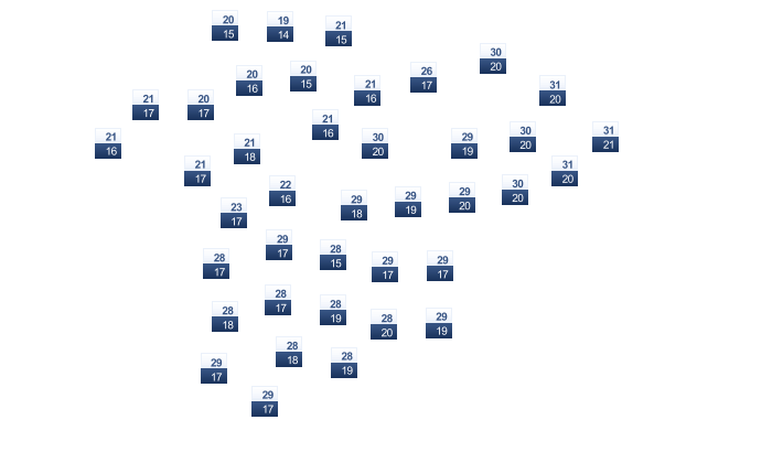 | 20 | 23 | 28 | 33 | 39 | 42 | 43 | 43 | 40 | 35 | 28 | 22 |