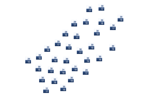 | 20 | 23 | 28 | 33 | 39 | 42 | 43 | 43 | 40 | 35 | 28 | 22 |