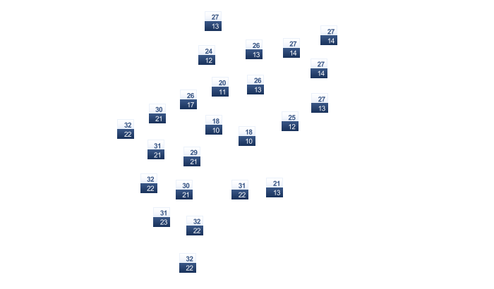 | 20 | 23 | 28 | 33 | 39 | 42 | 43 | 43 | 40 | 35 | 28 | 22 |