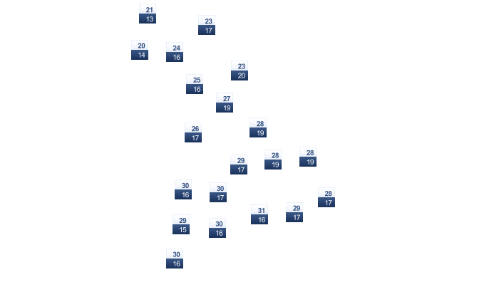 | 20 | 23 | 28 | 33 | 39 | 42 | 43 | 43 | 40 | 35 | 28 | 22 |