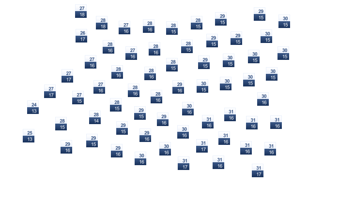 | 20 | 23 | 28 | 33 | 39 | 42 | 43 | 43 | 40 | 35 | 28 | 22 |