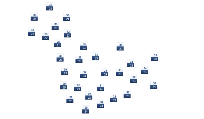 | 32 | 34 | 34 | 33 | 32 | 31 | 28 | 28 | 29 | 31 | 31 | 31 |