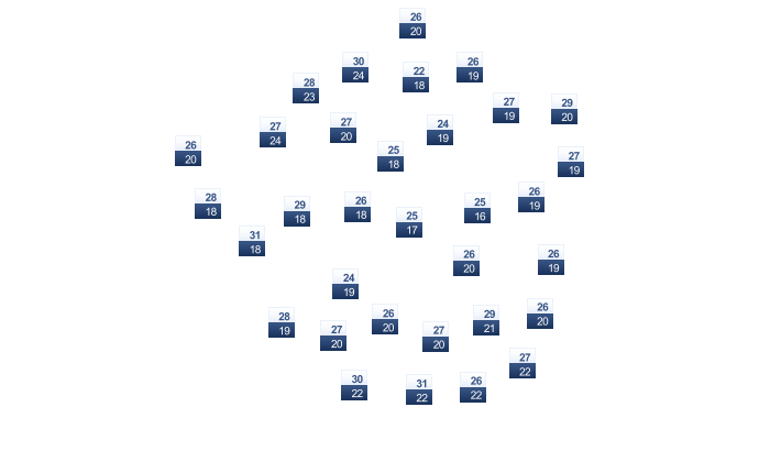 | 33 | 32 | 31 | 30 | 28 | 25 | 25 | 27 | 30 | 32 | 33 | 33 |
