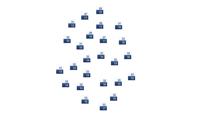 33 | 32 | 31 | 30 | 28 | 25 | 25 | 27 | 30 | 32 | 33 | 33 |