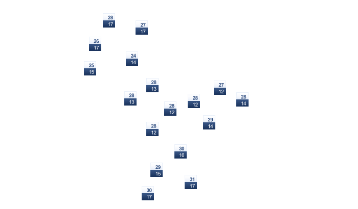 | 33 | 32 | 31 | 30 | 28 | 25 | 25 | 27 | 30 | 32 | 33 | 33 |
