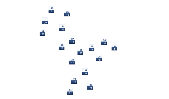 | 33 | 32 | 31 | 30 | 28 | 25 | 25 | 27 | 30 | 32 | 33 | 33 |