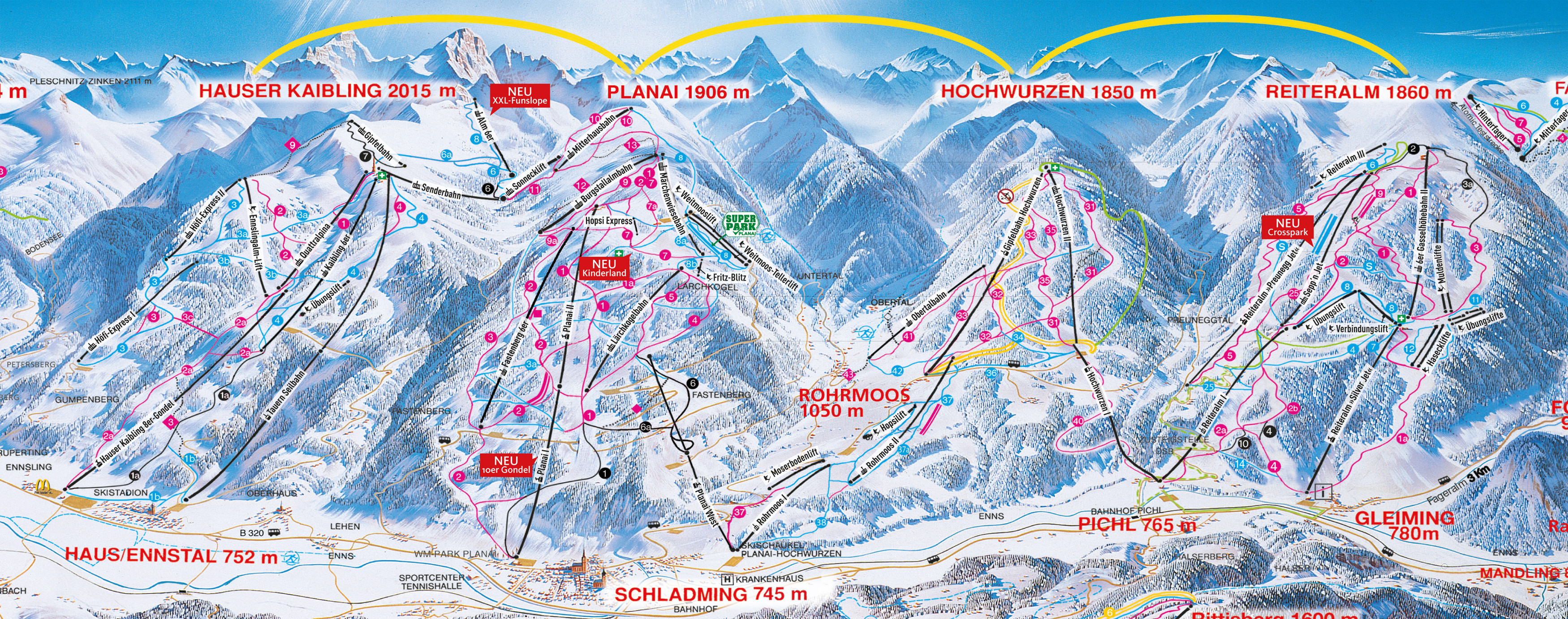 4 Berge Skischaukel (Planai/Hochwurzen/Hauser Kaibling/Reiteralm) liegt zwischen 750 (Tal) und 2015 Metern (Berg) Höhe.