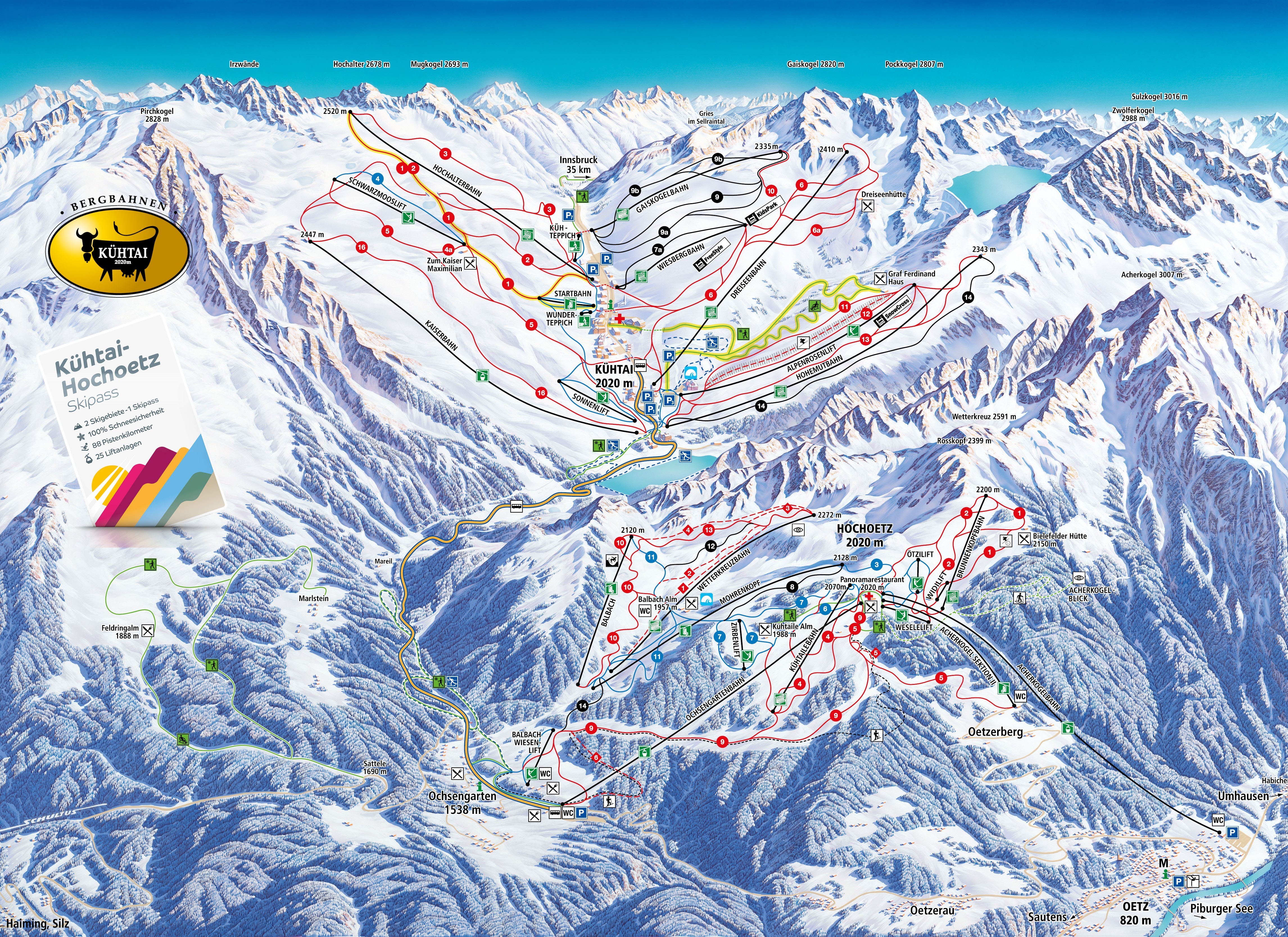 Österreichs höchstgelegener Wintersportort Kühtai (2020 Höhenmeter) und die Skiregion Hochoetz am Tor zum Ötztal empfangen die Besucher mit einem gemeinsamen Ski(s)pass für über 80 Pistenkilometer. Die breite Vielfalt an verfügbaren Pisten erfreut Skicracks und Anfänger gleichermaßen. Durch die Ost-West-Ausrichtung des Sellraintals profitieren Ski- und Snowboardfahrer am Südhang von besonders guter Sonneneinstrahlung. Breite Pisten und angenehme Sessellifte sorgen dafür, dass sich ungeübte Skifahrer auf sich konzentrieren können und auf der Piste kein Gedränge entsteht. Dazu stehen zahlreiche Pistenkilometer mit der blauen Markierung für leichte Abfahrten zur Verfügung. Wer sich etwas schwierigere Pisten zutraut, der findet sich ganz schnell auf einem Abschnitt der über 26 Kilometer an mittelschweren Abfahrten wieder und auch Skiprofis fühlen sich auf den anspruchsvollen schwarzen Pisten schnell daheim.