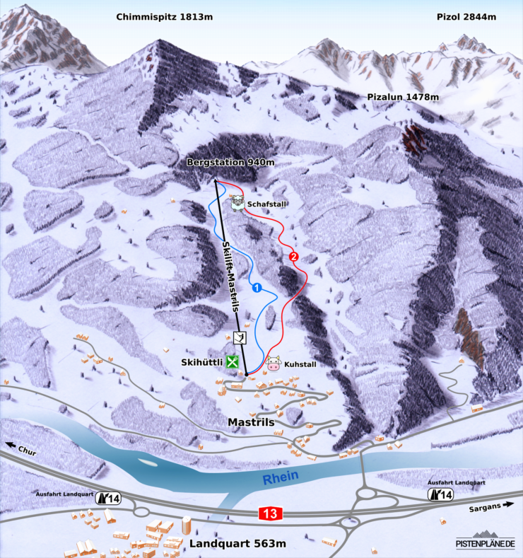 Skilift Mastrils liegt zwischen 720 (Tal) und 940 Metern (Berg) Höhe.