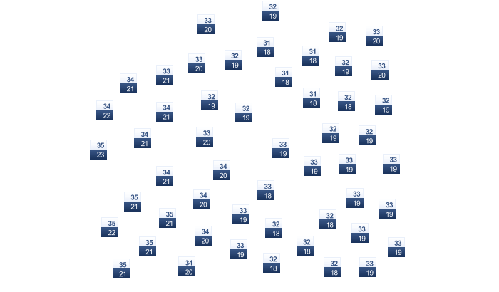 | 20 | 22 | 23 | 25 | 27 | 30 | 31 | 31 | 29 | 24 | 22 | 20 |