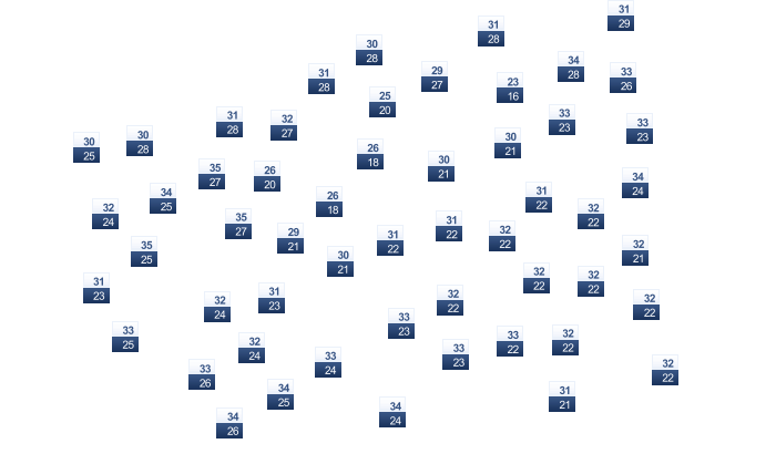 | 20 | 22 | 23 | 25 | 27 | 30 | 31 | 31 | 29 | 24 | 22 | 20 |