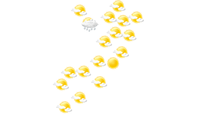 In Marka strahlt tagsüber die Sonne und die Temperaturen liegen zwischen 27 und 30°C. In der Nacht bilden sich leichte Wolken bei Tiefsttemperaturen von 28°C. Mit Geschwindigkeiten von 17 bis 28 km/h weht der Wind aus südlicher Richtung.