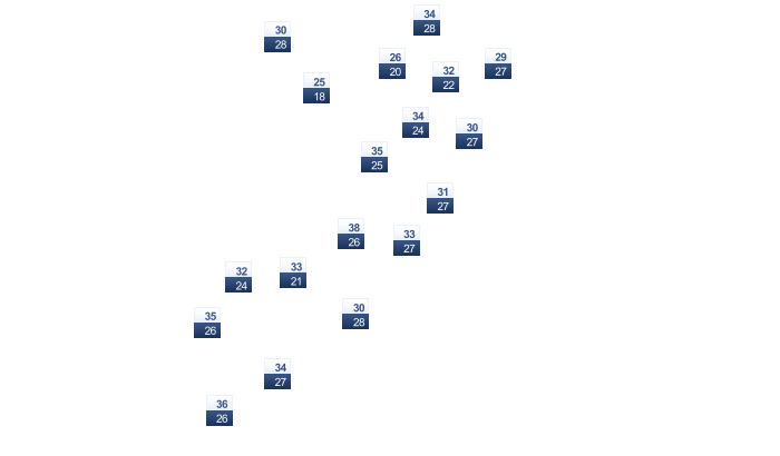 | 20 | 22 | 23 | 25 | 27 | 30 | 31 | 31 | 29 | 24 | 22 | 20 |